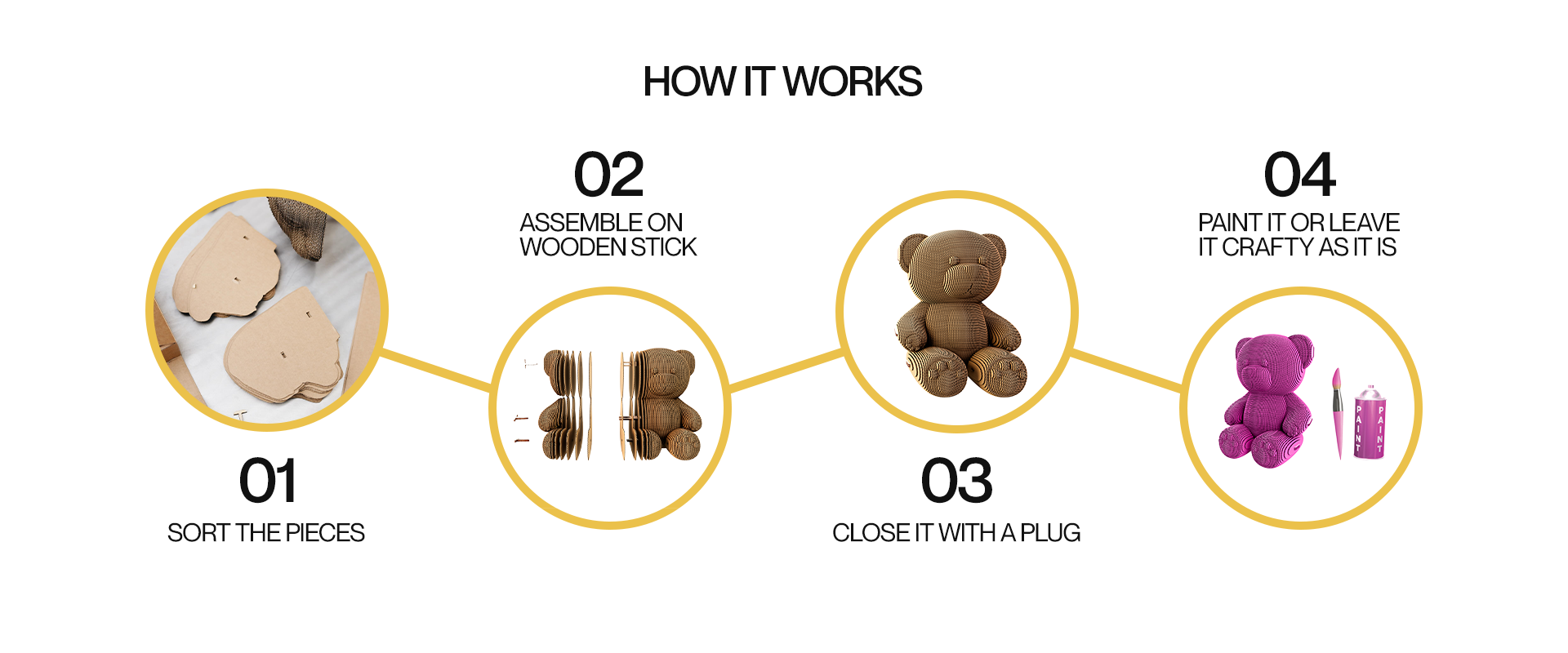 • Pre-cut, numbered eco-friendly cardboard pieces that simply click together on a wooden stand